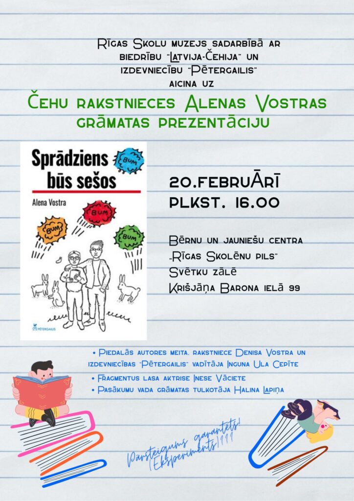 Rīgas Skolu muzejā 20.februārī plkst.16.00 BJC “Rīgas Skolēnu pils” Svētku zālē čehu rakstnieces Alenas Vostras grāmatas “SPRĀDZIENS BŪS SEŠOS” atklāšanas pasākums. Grāmatā stāstīts par to, kā beidzas piektklasnieka Ludviķa Četrpadsmitā aizraušanās ar fizikas eksperimentiem. Vizuālos efektus sarūpējis BJC “Rīgas Skolēnu pils” Radioelektronikas pulciņš; par eksperimentu rūpēsies LU CFI pārstāvji. Gaidāms neliels muzikālais pārsteigums! Visi interesenti laipni gaidīti K.Barona ielā 99, Rīgā.
